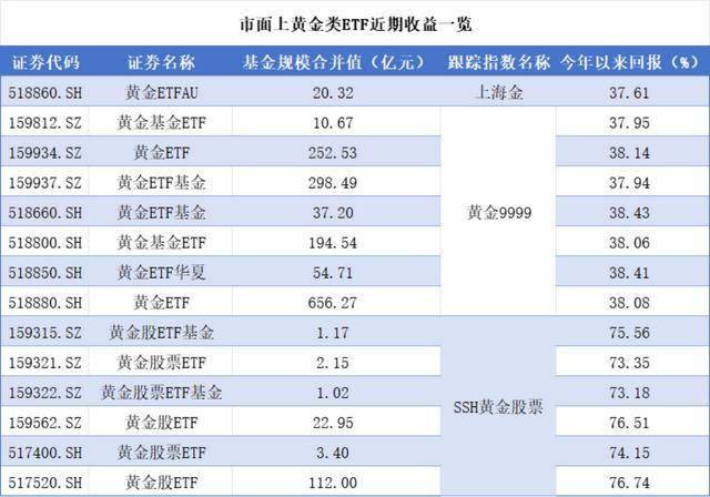 收益最高的黄金ETF是黄金ETF基金(518660.SH),今年以来收益为38.4%;收益最高的黄金股ETF是黄金股ETF(517520.SH),今年以来收益为76.7%。