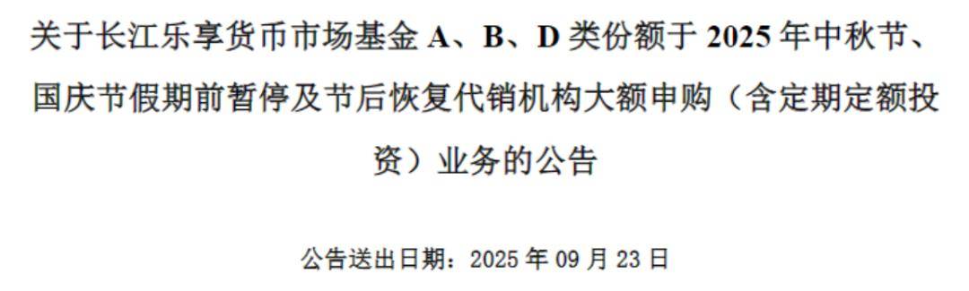 一些货币基金同样发布“限购令”。例如,长江资管旗下的长江乐享货币(003363.OF)自9月25日起对单日单个账户申购金额超过100万元的部分不再受理,并将在10月9日恢复。