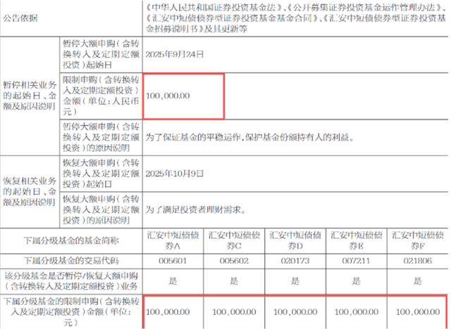 汇安基金公告称,汇安中短债债券(005601.OF)自9月24日起对单个账户单日累计申购金额超过10万元的部分实施限购,直至10月9日恢复。