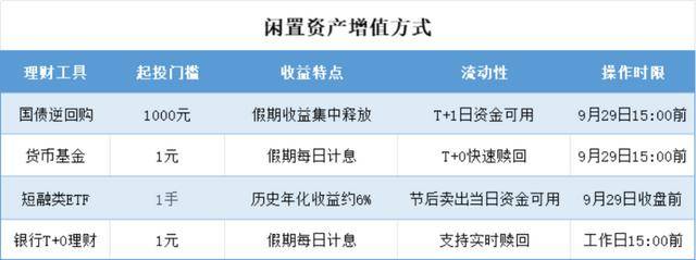 若在9月29日(节前倒数第二个交易日)下午3点前操作1天期逆回购,可覆盖假期全部9天利息,资金次日即可用于其他投资。搭配货币基金,节前15点前申购可享8天收益。