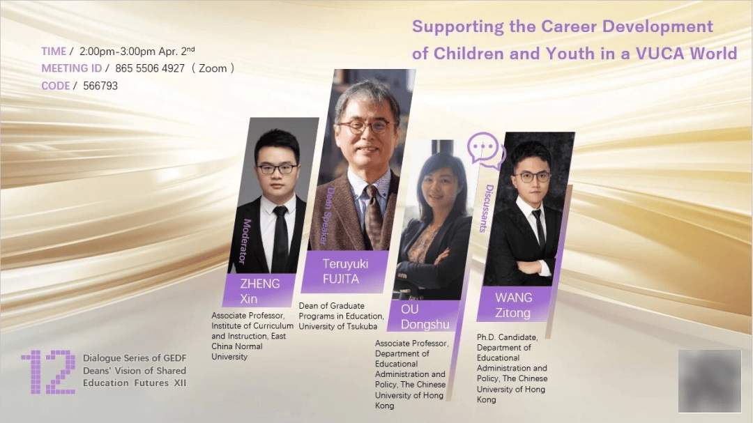 2. 四场“GEDF院长展望教育未来”季度活动邀请筑波大学教育研究生院院长藤田晃之(Teruyuki Fujita)教授、香港教育大学教育及人类发展学院院长Bruce Macfarlane教授、英国诺丁汉大学教育学院院长Volker Wedekind教授、爱尔兰玛丽伊玛克特学院教育学院院长Emer Ring教授,与四校青年学者和博士生对话,聚焦教育本质的批判性反思、学术领导力的价值重塑、青少年生涯发展的核心能力培养以及教育话语权,共同倡导教育应超越功利主义,回归人本关怀与社会责任担当。