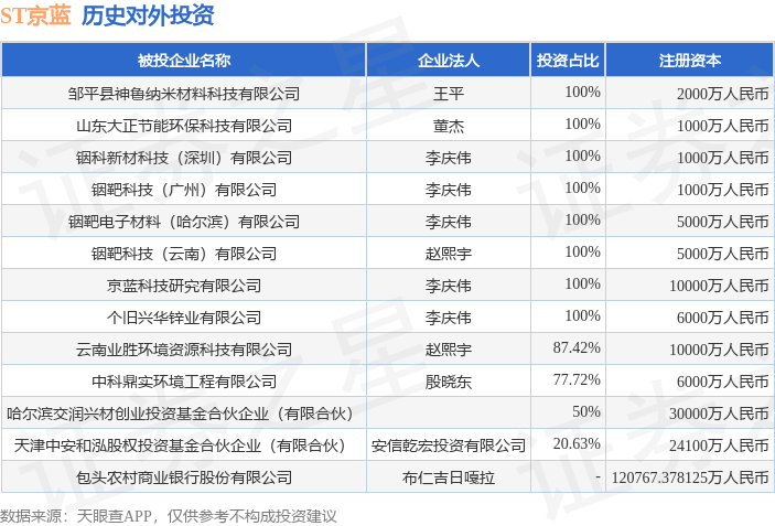 2026-01-01半岛体育,半岛体育官方网站,半岛体育APP下载证券之星消息,根据天眼查APP显示,ST京蓝(000711.SZ)新增一起对外投资事件,被投资公司为哈尔滨交润兴材创业投资基金合伙企业(有限合伙),法定代表人,投资占比为50%。该公司从事资本市场服务,注册资本为30000万人民币。目前,ST京蓝共存在对外投资13项,详见下表: