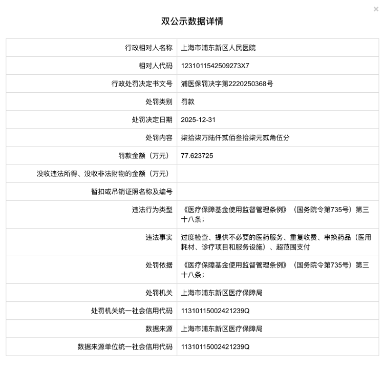 2026-01-11半岛体育,半岛体育官方网站,半岛体育APP下载近日,上海市浦东新区医疗保障局公布了一则行政处罚信息,上海市浦东新区人民医院因存在多项违反医疗保障基金使用管理规定的行为,被罚款人民币77.623725万元。
