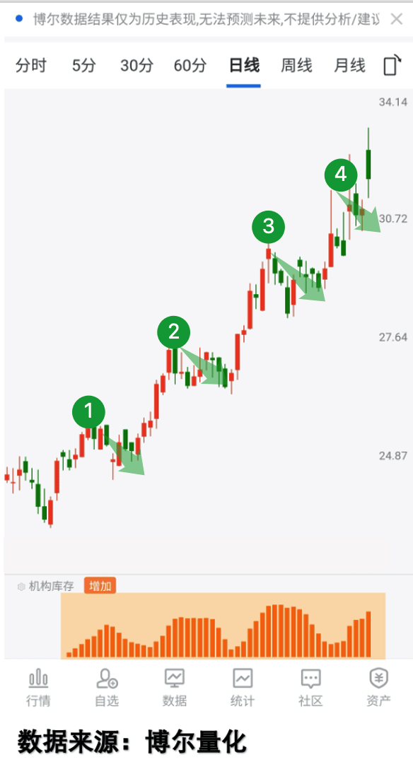 看图1:这只标的不到三个月走势大幅攀升,但每次新高后就回调,光看走势容易慌。但「机构库存」全程持续,说明机构一直在积极参与,根本不用瞎猜。