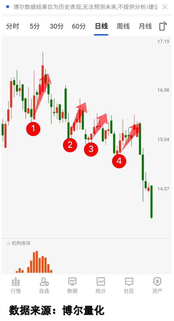 看图3:这只标的在回落途中多次出现反弹,但「机构库存」全程空白,说明反弹只是表面热闹,没有真实机构资金支撑,最终还是会继续调整。