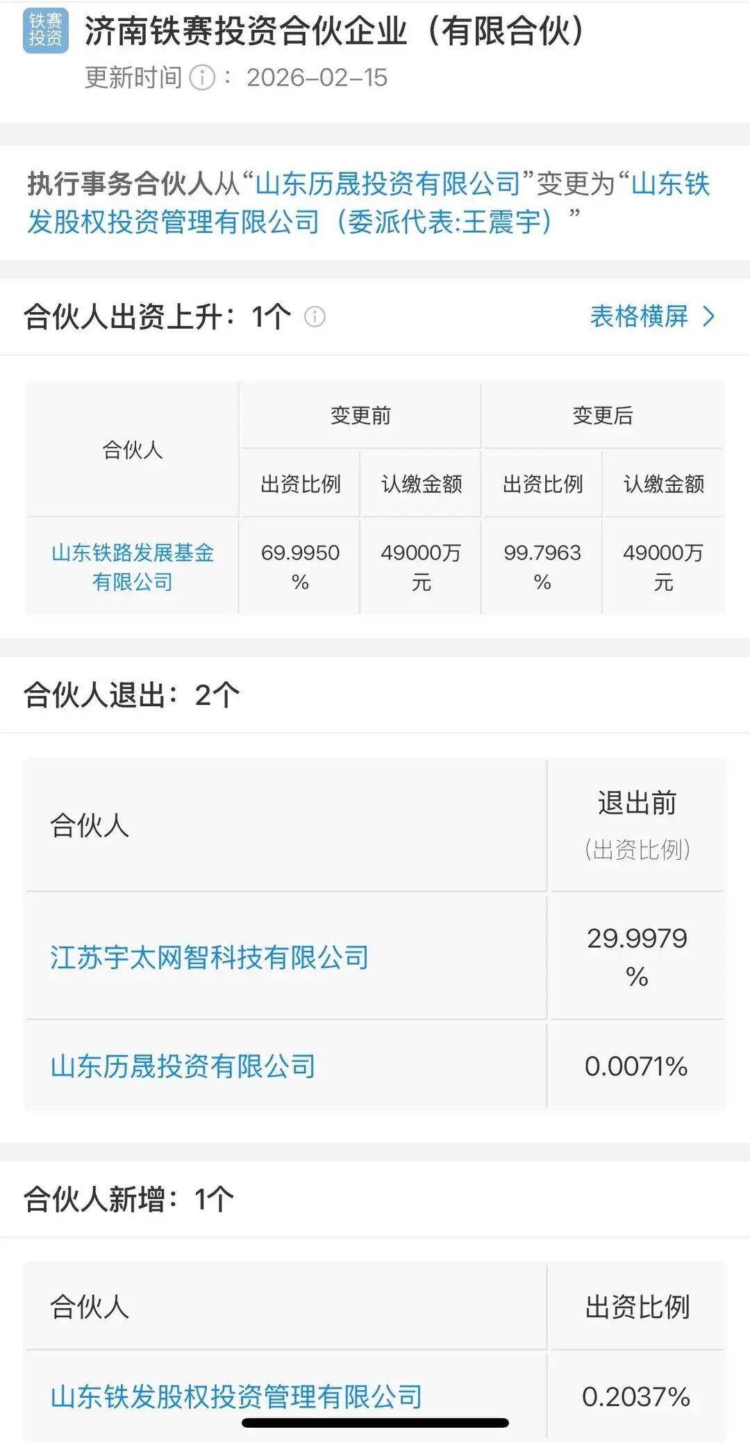 2026-02-22半岛体育,半岛体育官方网站,半岛体育APP下载近日,济南铁赛投资合伙企业(有限合伙)发生工商变更,原合伙人山东铁路发展基金有限公司(下称“山东铁路基金”)出资比例从69.995%增至99.796%;另外,两名合伙人江苏宇太网智科技有限公司、山东历晟投资有限公司退出,退出之前,这两名合伙人出资比例分别为29.998%、0.007%;同时,济南铁赛投资合伙企业(有限合伙)新增合伙人山东铁发股权投资管理有限公司,其出资比例为0.204%。