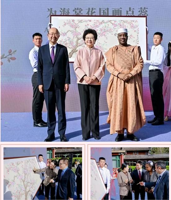 李斌与中国政府非洲事务特别代表刘显法、非洲联盟驻华代表巴赫一起,在为此次活动新创作的国画《春满乾坤》上点落花蕊,并宣布活动开幕。