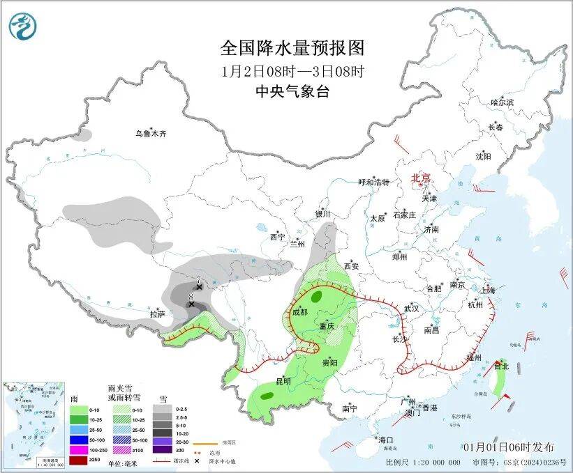 1月2日8时至3日8时,新疆南疆高海拔山区、西藏北部、青海南部、甘肃东部和南部、宁夏南部、陕西南部、川西高原北部、贵州西北部等地部分地区有小雪或雨夹雪,其中,西藏东部等地部分地区有中到大雪(5~8毫米)。西藏东南部、西南地区东部和南部、台湾岛等地部分地区有小雨,局地中雨。内蒙古中部、辽东半岛等地部分地区有4~5级风;黄海大部海域、东海大部海域、台湾海峡、台湾以东洋面、巴士海峡、南海大部海域将有7~8级、阵风9~10级的大风,其中台湾海峡部分海域风力可达9级、阵风10~11级,北部湾将有7级、阵风8级的东北风。