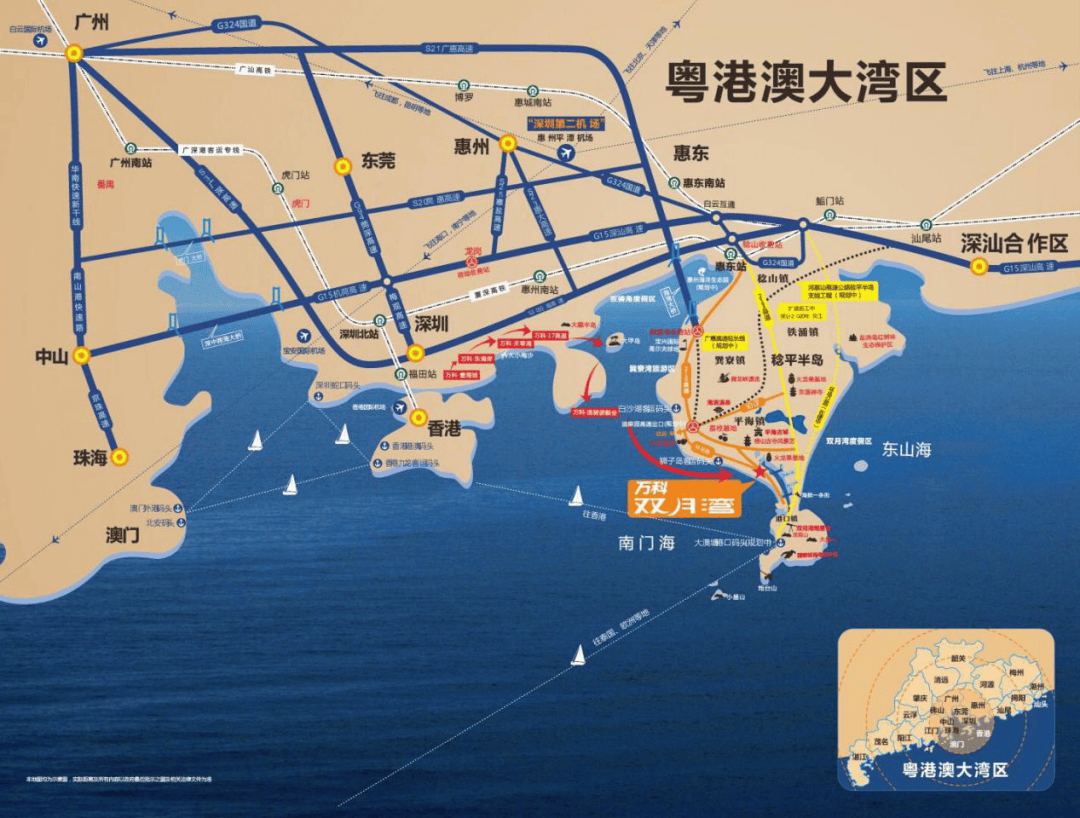 项目位于粤港澳大湾区惠东县稔平半岛双月湾旅游度假区。位于珠三角的黄金度假圈之内,4条高速,1个机场,2条高铁的立体交通网。